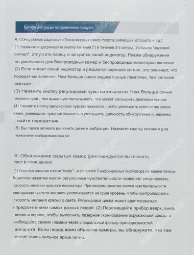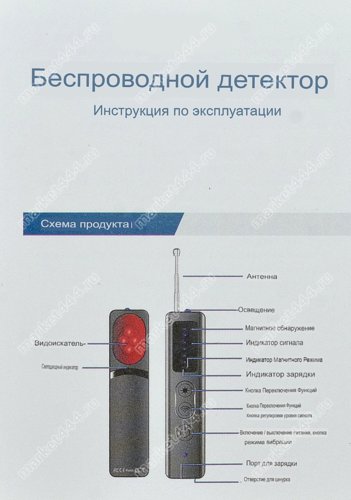 | Режимы работы, поиска | 1) Электромагнитному излучению. 2) Магнитному полю. 3) Визуальный поиск скрытых микро видеокамер при ИК. 4) Фонарик. 5) Противоугонная сигнализация. |